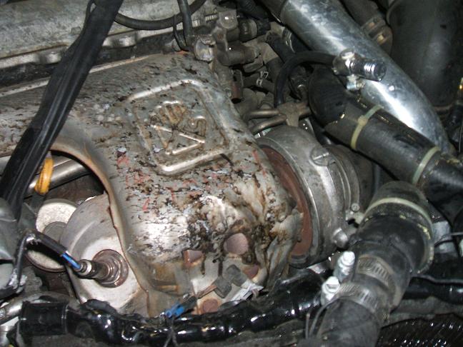 single-piece manifold/turbine: Engine installed with the turbo clocked to